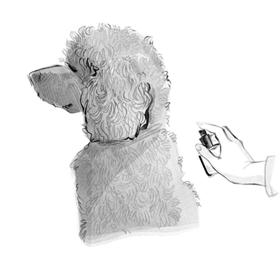 Cover your dog’s eyes with your hand when spraying near the face. Avoid spraying near the mouth or nose.