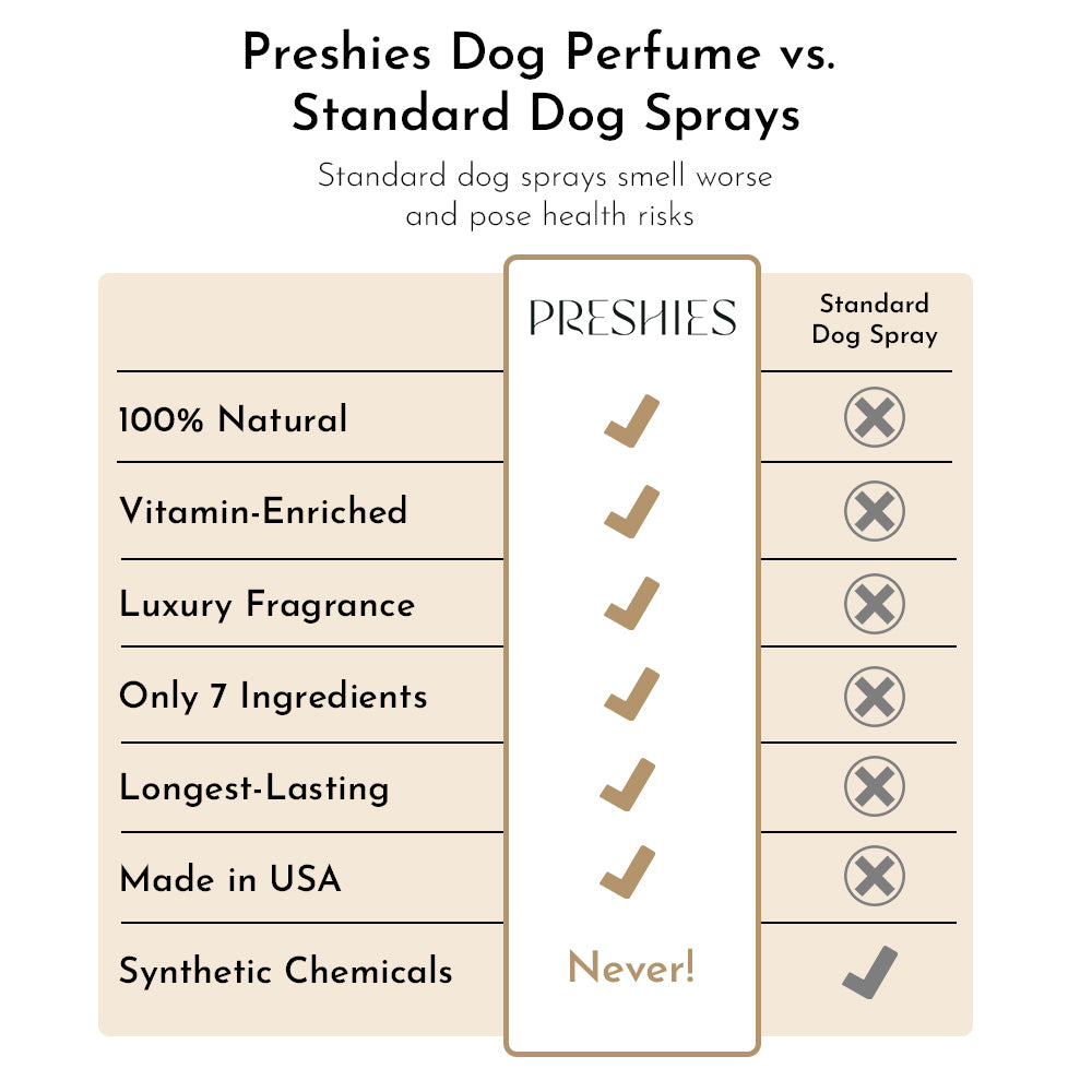 There is nothing worse than a stinky dog smell! Preshies keeps our old man smelling fresh between baths and makes snuggling even more enjoyable. We have the cedar and patchouli perfume and appreciate that the smell is not too overwhelming. I also spray his bed to give his area an extra boost of freshness.