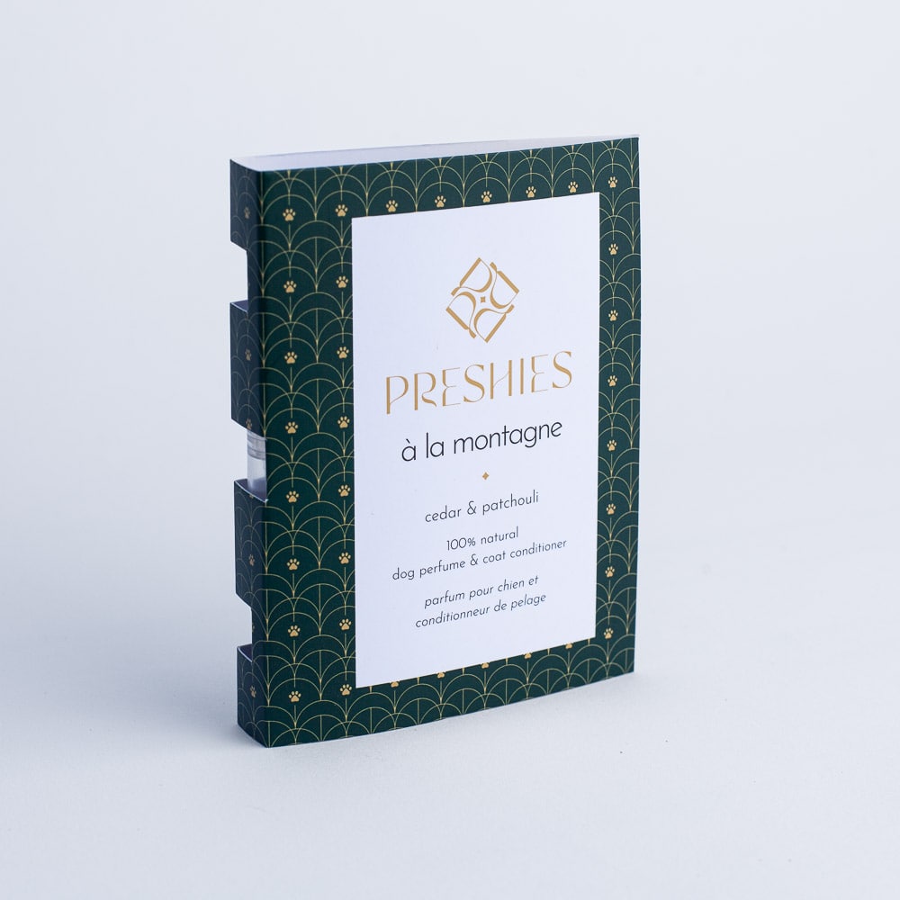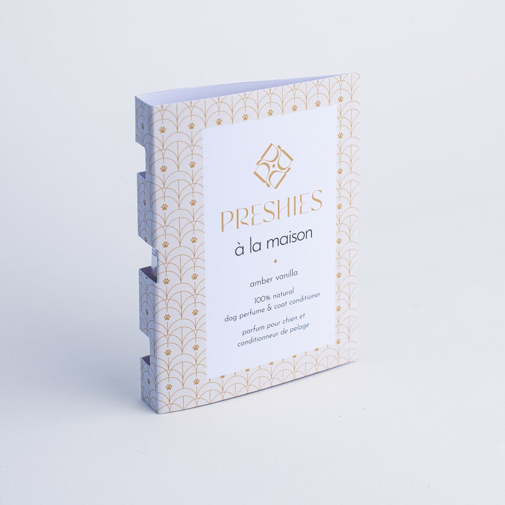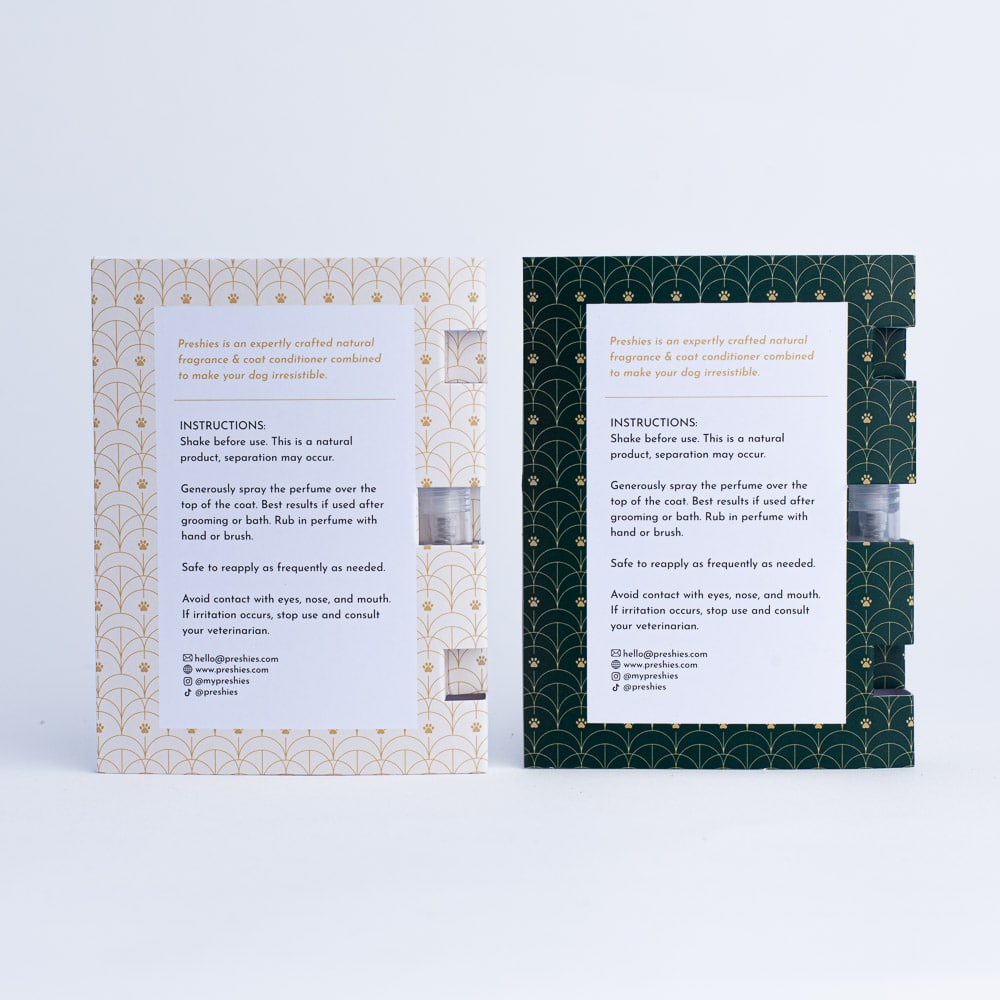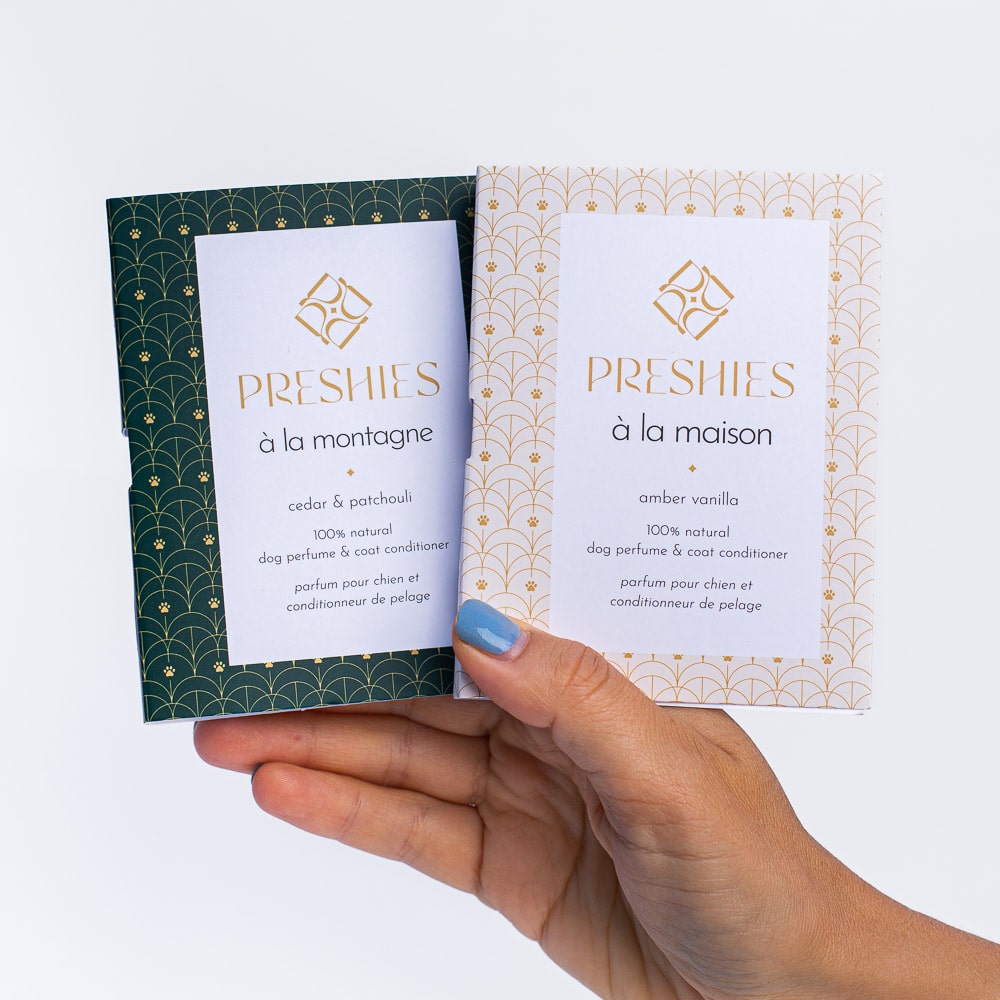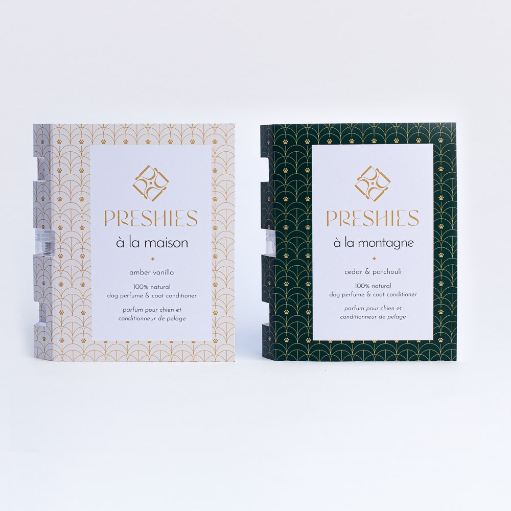 Preshies 100% natural dog perfume and coat conditioner sample set is the perfect way to try both fragrances to find out which one you love.
